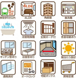 リフォーム済/南向きバルコニー/浴室乾燥機/食器洗浄乾燥機/システムキッチン/シャンプードレッサー/対面式キッチン/シャワートイレ/TVモニタ付インターホン/オートロック/浴室に窓/全居室収納/角部屋/専用ポーチ/エレベーター/駐輪場/宅配ボックス/バイク置き場/セキュリティ充実/スーパー徒歩10分以内/病院 徒歩10分以内/学校 徒歩10分以内