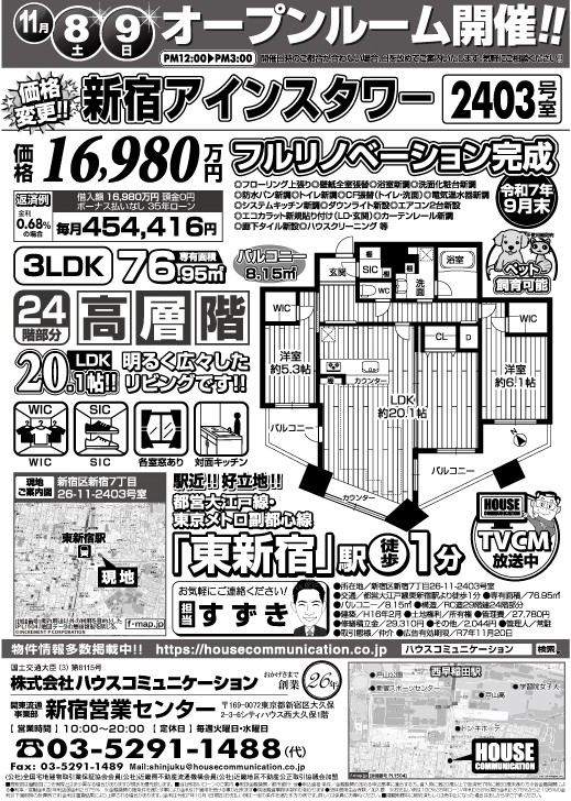 11/8(土)~11/9(日) オープンハウス! 新宿営業センター 不動産購入売却 広告チラシ 新宿アインスタワ-