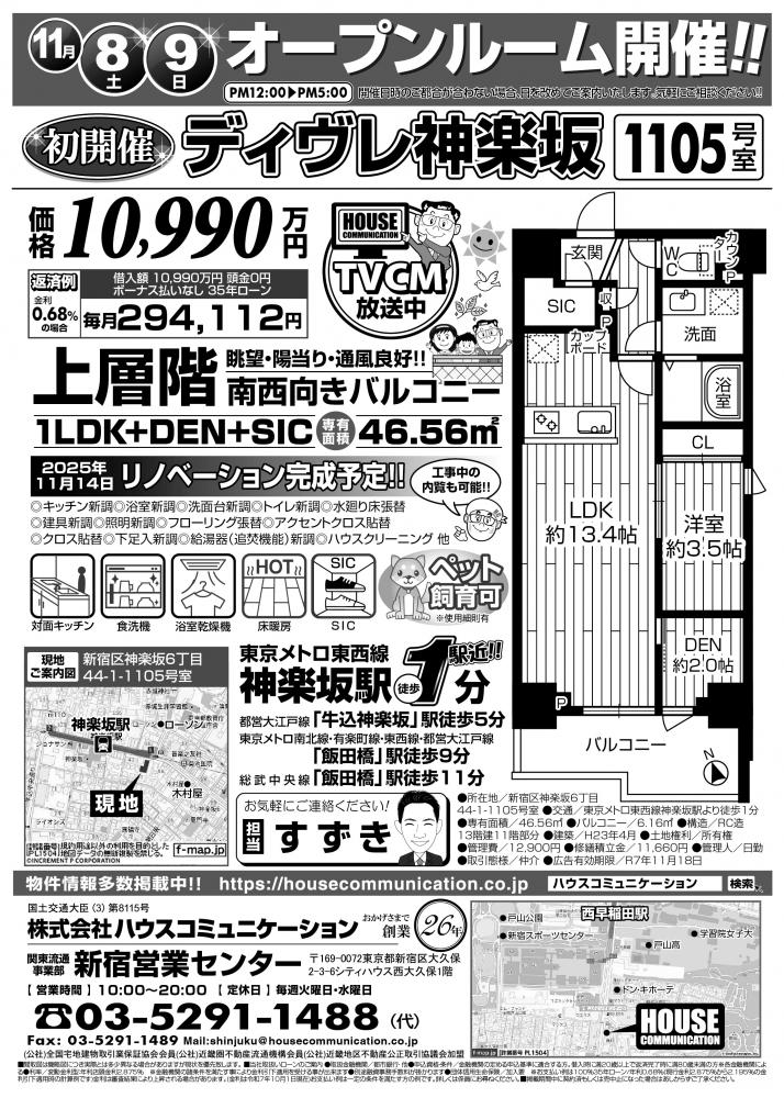 11/8(土)~11/9(日) オープンハウス! 新宿営業センター 不動産購入売却 広告チラシ ディヴレ神楽坂