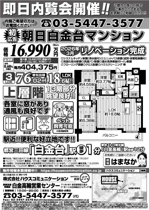 即日内覧会! 白金高輪営業センター 朝日白金台マンション
