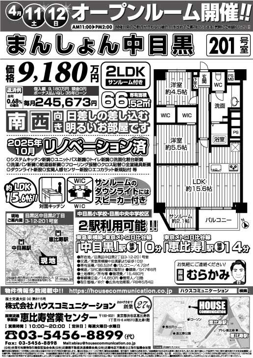 4/11(土)~4/12(日) オープンルーム! 恵比寿営業センター まんしょん中目黒